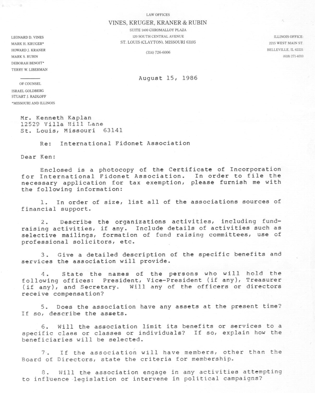 | Certification of International Fidonet Association (IFNA) (August 15, 1986) (Page 1)